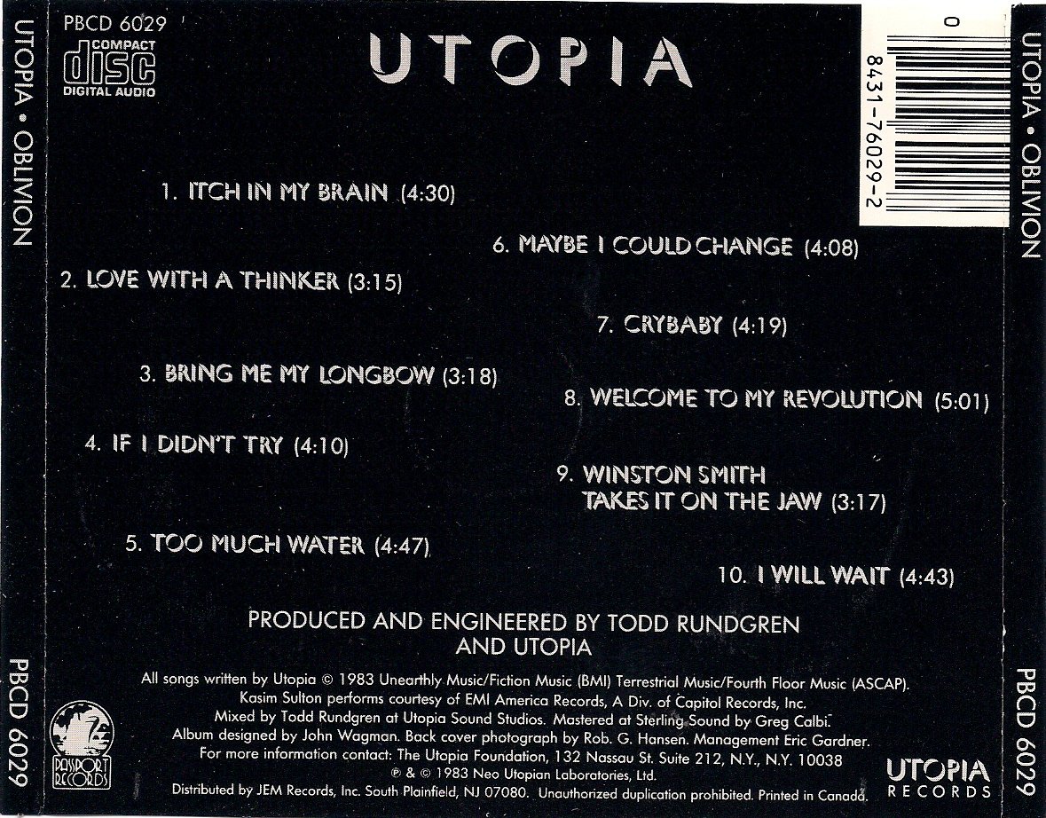 Utopia oblivion album. Discogs utopia oblivion cd utopia what shouldve been a great album is spoiled by the electronic drums. Digitally re mastered and expanded disc cd ntscregion 0 dvd edition of this 1983 album from todd rundgren and utopia including a bonus dvd that contains the concert film live at the royal oak detroit filmed in 1981. Full condensed blue highlight denotes album pick filter discography by albums compilations singles eps others.